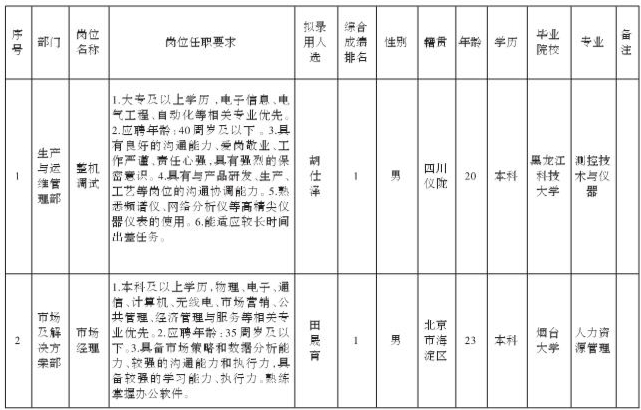 根据四川九洲防控科技有限责任公司发布的招聘公告及招聘相关规定,经测试、考察、体检等程序,拟录用胡仕泽等2名同志到四川九洲防控科技有限责任公司工作,现予以公示,具体情况如下: