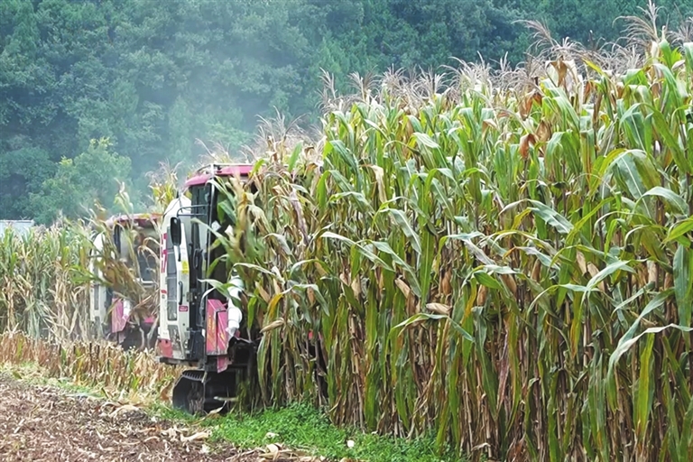 近日,在梓潼县文昌镇龙口村,一台台履带式收割机在玉米地里来回穿梭。玉米秆整齐卷入,在剥去玉米穗的苞叶后,再通过脱粒装置分离金黄的籽粒与穗轴,最后将籽粒筛选干净,顺着管道涌入随行的运输车,再拉到烘干房烘干。秸秆则被粉碎切割成细碎的草屑,均匀地撒向田间,化作滋养土地的天然肥料。