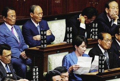 10月21日,在日本东京,自民党总裁高市早苗(前排右二)在临时国会众议院首相指名选举现场阅读文件。新华社记者 贾浩成 摄