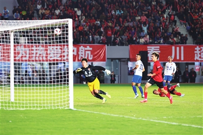 比赛第30分钟,绵阳队30号球员周翥禁区内接队友传中,高高跃起头槌建功,攻入本场比赛唯一进球。