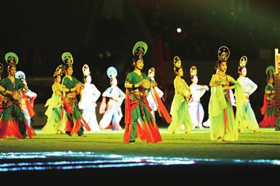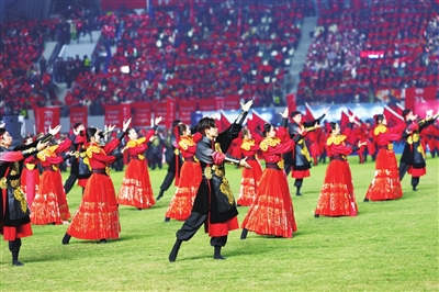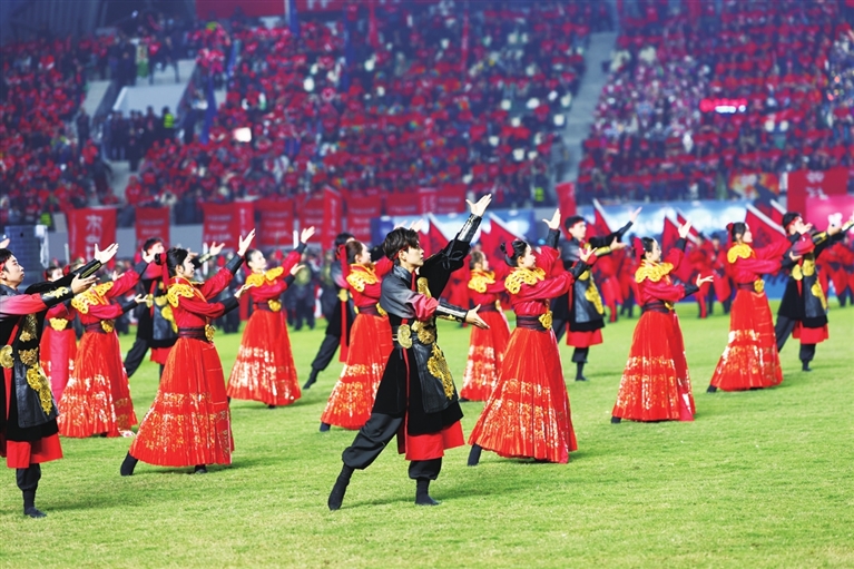 从开场表演《郪风唐韵》,“凤凰于飞”灯光秀光影流转,凤翼翩然,到充满青春气息的团体操,两地文化符号轮番上演,将古风古韵与团结热烈的氛围拉满。