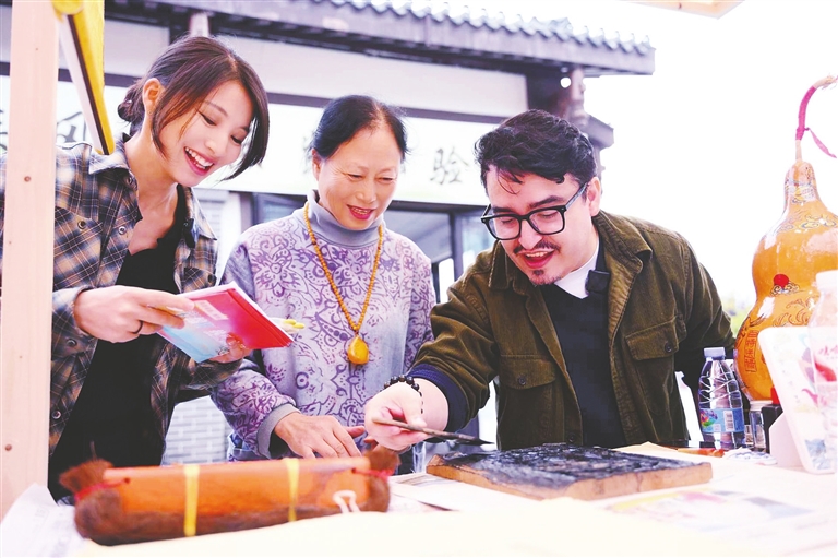 在“多彩绵阳 ·热烈滚烫”城市推广活动第二场非遗专场非遗体验区,外国游客体验梓潼木刻年画。