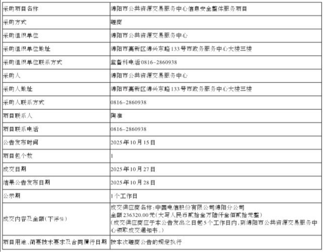 绵阳市公共资源交易服务中心关于“信息安全整体服务”项目采购结果的公告