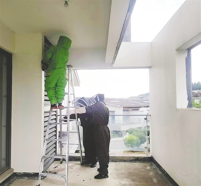 为保障安全,刘康宁身着专业防蜂服,使用密封捕蜂箱等工具,迅速而稳妥地将蜂巢完整清除,并对周边区域进行驱虫处理,防止蜂群返回。
