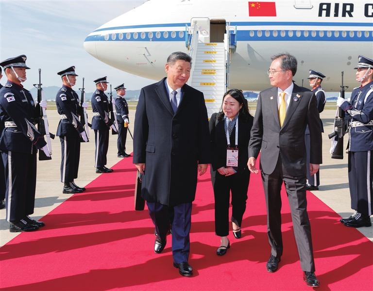 习近平抵达釜山金海国际机场时,韩国外长赵显等高级官员热情迎接。礼兵分列红地毯两侧致敬,军乐团演奏行进乐,机场鸣放21响礼炮。