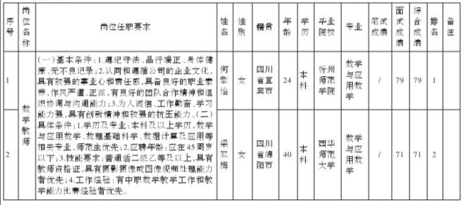 四川九洲教育投资管理有限公司关于招聘数学教师测试成绩的公示