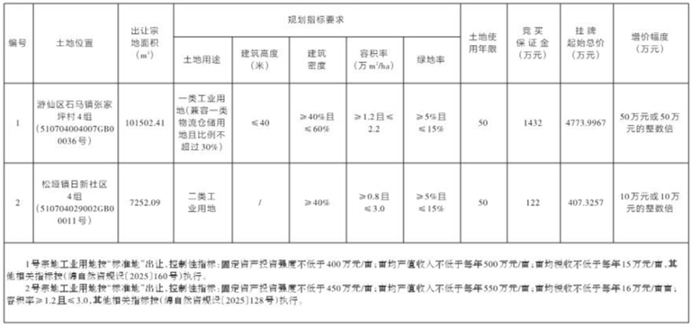 上述宗地均以现状出让,1号宗地其他规划要求详见绵阳市自然资源和规划局《地块规划条件》(绵自然资规设〔2025〕160号);2号宗地其他规划要求详见绵阳市自然资源和规划局《地块规划条件》(绵自然资规设〔2025〕128号)。