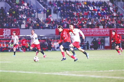 绵阳队球员(红)带球进攻 记者 陈冬冬 摄