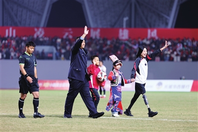比赛正式开场前,2024年度“中国好人”、全国自强模范、北川姑娘牛钰,与山东援建北川干部、中国青年志愿服务银奖、四川省五四青年奖章获得者王鹏来到“川超”绵阳主场,作为开球嘉宾为比赛开球。