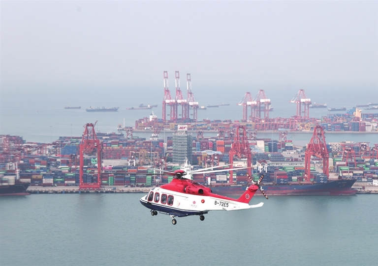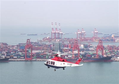 11月2日,直升机搭载圣火进行空中传递。 新华社记者 梁旭 摄