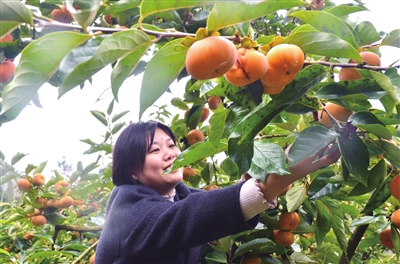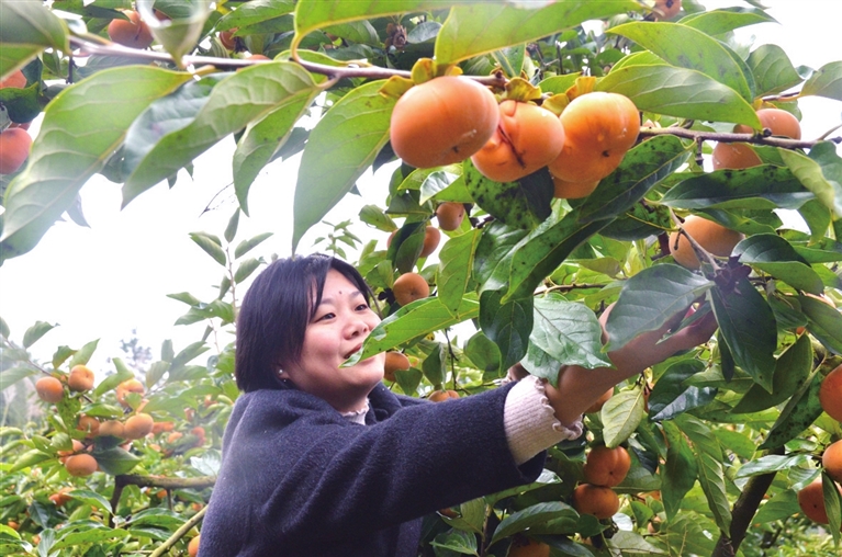 在柿子园深处,记者遇到了正采收柿子的业主陈洪。“今年的脆柿子简直不愁销,最多再有10天就能卖光。”陈洪忙里偷闲跟记者介绍起了柿子园,他家柿子园建了20年,现有面积20多亩,柿子树总数达1500余株,通过品种改良,全部为“脆柿子”。过去柿子成熟了,全靠肩挑背扛辗转到周边几个集镇去赶场销售,近几年网络发达了,开始尝试电商销售和直播带货,并吸引游客入园采摘。现在马角镇又组建起了集体经济公司,跟他家签订了5万斤的包销合同,真正为柿子园增收“打包票”。今年他家柿子总产量接近5万公斤,产值超过20万元。
