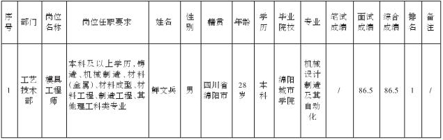 四川波鸿实业有限公司关于招聘四川威斯卡特工业有限公司绵阳分公司模具工程师岗位测试成绩的公示