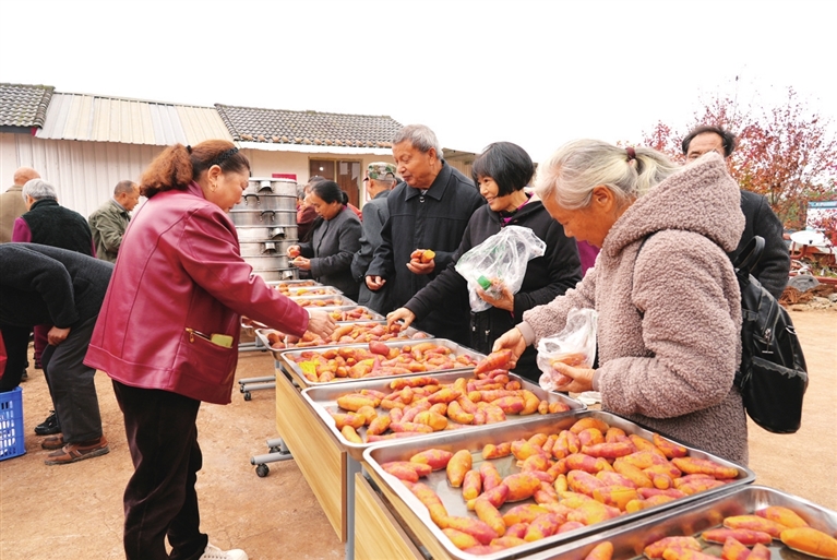蒸薯区香气四溢,村民纷纷前来品尝。