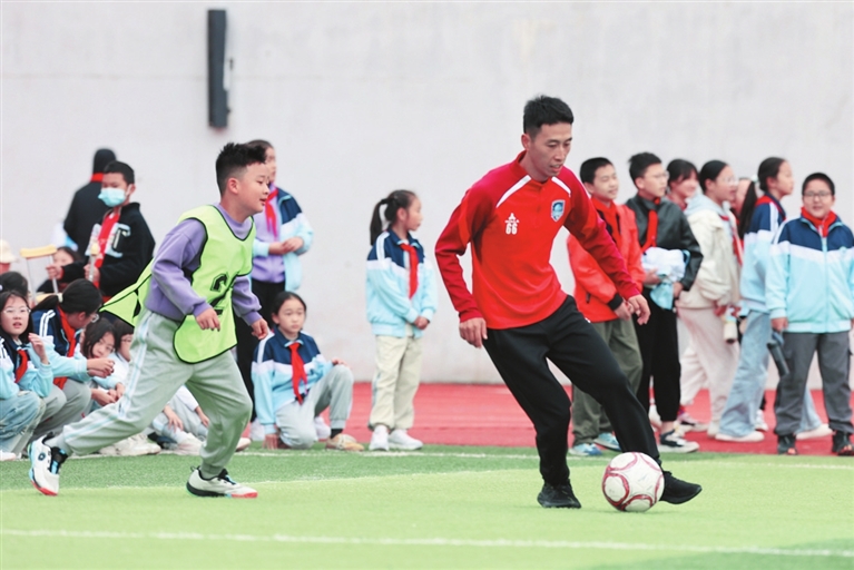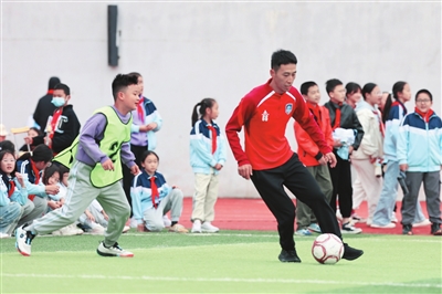 随后,裁判员、运动员代表进行了宣誓。现场,九洲长虹队球员钱虹君亲自为比赛开球,他还与学生们亲切互动,现场演示颠球技巧,耐心指导孩子们如何控制球的节奏和力度。孩子们纷纷围在他身边,认真聆听、仔细模仿。不仅如此,钱虹君还参与到班级间的踢球比赛中,与孩子们同场竞技,欢声笑语回荡在整个校园。
