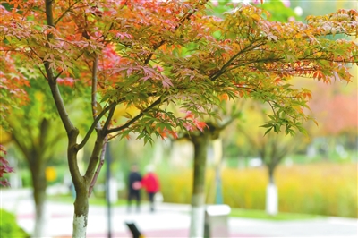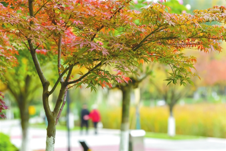 立冬过后,绵阳城区公园广场的树木悄然披上了绚丽的“彩装”,宁静又迷人。绿道旁、湖岸边,一簇簇枫叶灼灼似火,棵棵垂柳泛起点点金黄,就连樱花树叶也渲染出片片绯霞。层层叠叠的艳丽色彩交织融合,晕染成一幅层林尽染、斑斓夺目的城市画卷。市民游客沿步道悠然漫步,或驻足静赏,或结伴聊天,在这美好的初冬时节里,悠然享受着这份惬意的休闲时光。 (记者 王勇 摄影报道)