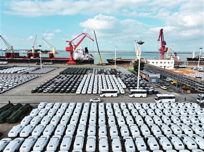 10月14日,在江苏省连云港港东方港务分公司码头,大批汽车准备装船外运(无人机照片)。 新华社发 王春 摄