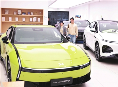 10月14日,在湖北省武汉市武昌区一家商场,顾客在选购新能源汽车。 新华社发 赵军 摄