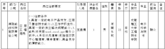 根据绵阳燃气集团发布的招聘公告及招聘相关规定,经笔试、面试等程序,拟录用王昱博同志到绵阳能创科技有限责任公司工作,现予以公示,具体情况如下: