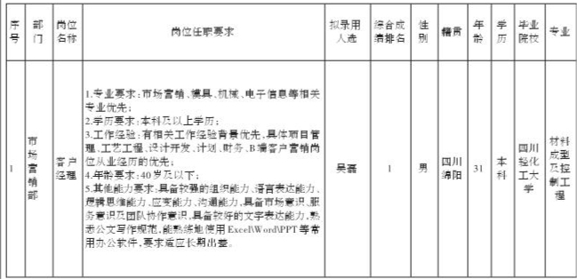 根据四川爱创科技有限公司发布的招聘公告及招聘相关规定,经面试、考察、体检等程序,拟录用吴磊同志到市场营销部工作,现予以公示,具体情况如下: