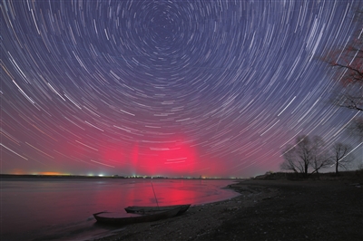 11月12日夜至11月13日凌晨,受地磁暴影响,中国最北省份黑龙江多地观测到绚丽极光。这是11月12日在黑龙江省齐齐哈尔市嫩江江畔拍摄的绚丽极光(堆栈合成照片)。