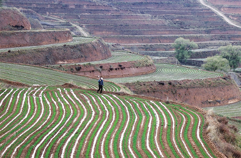 11月10日,在甘肃省平凉市静宁县三合乡前咀村,农民在覆膜后的冬小麦田里劳作。 新华社发 王毅 摄