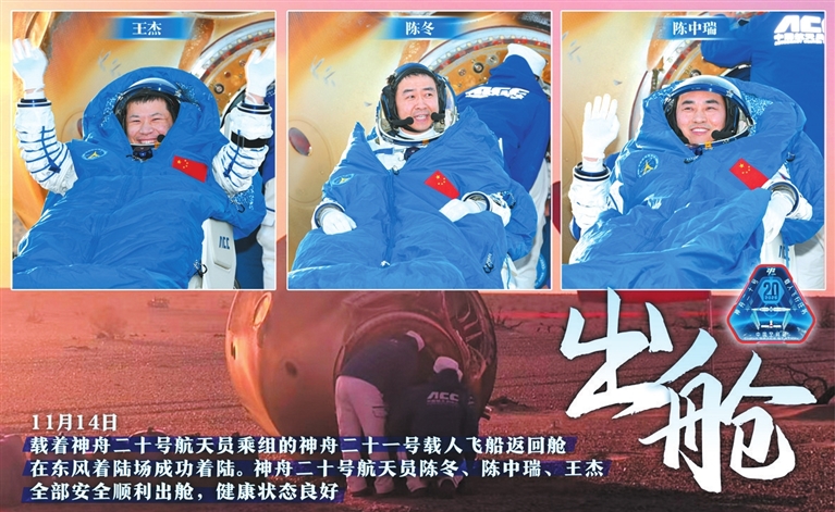 14日16时40分,神舟二十一号载人飞船返回舱在东风着陆场成功着陆。返回舱舱门打开后,神舟二十号航天员陈冬、陈中瑞、王杰安全顺利出舱,健康状态良好。