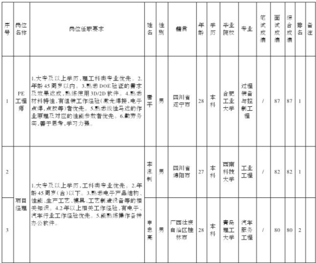 四川安和精密电子电器股份有限公司关于招聘PE工程师等岗位测试成绩的公示