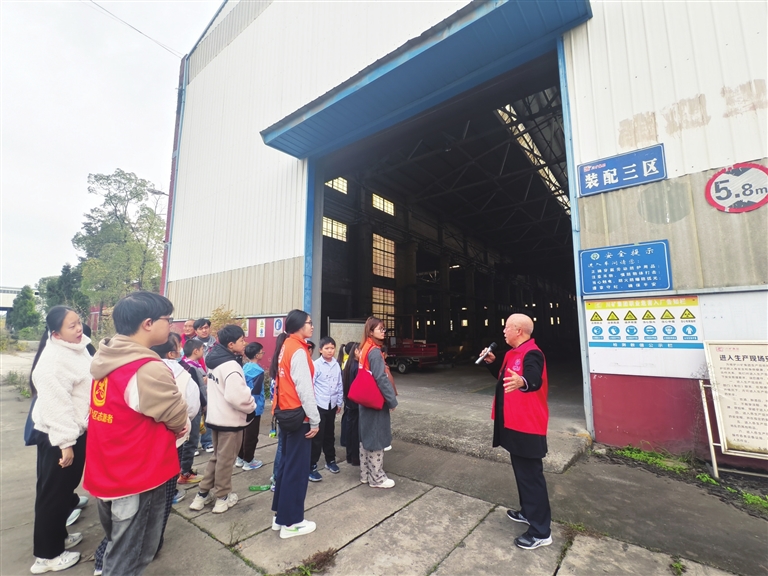 11月15日,三合镇川矿社区联合向阳社会工作服务中心开展“童寻三线迹,薪火代代传”活动,组织同学们走进四川矿山机器厂,参观“三线建设”老工业基地。“我进厂时比你们大不了多少,当时工厂百废待兴,大家都住窝棚。”81岁的退休工人徐宽勋作为银发志愿者,现场绘声绘色地讲述建厂岁月,让孩子们的思绪穿越到“三线建设”的激情年代。