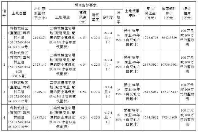 经绵阳市人民政府批准,绵阳科技城新区管理委员会决定以拍卖方式出让四宗国有建设用地使用权,绵阳市公共资源交易服务中心具体组织实施本次拍卖出让活动,现将有关事项公告如下: