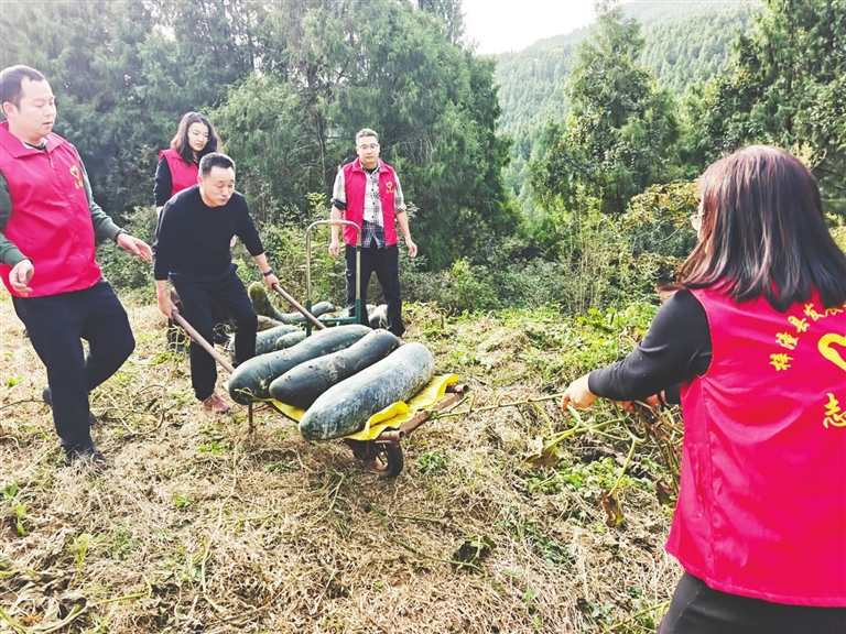 监测户张福金家中种植的上千斤冬瓜正值成熟采摘期。然而,由于其家中劳动力严重不足,采收和销售成了压在他心头的一块大石。获悉这一情况后,梓潼县发改局机关党支部迅速响应,组织党员志愿者服务队奔赴田间地头,帮助抢收冬瓜。