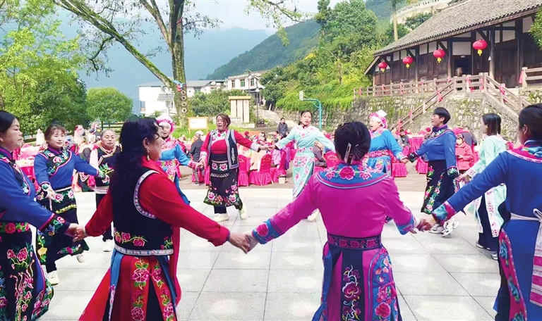 村民们在村里的百年皂角树下载歌载舞。 北川融媒供图