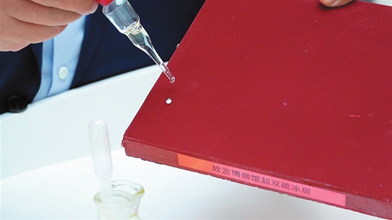 工作人员将自来水滴在红砖表面,水流瞬间凝聚成珠。