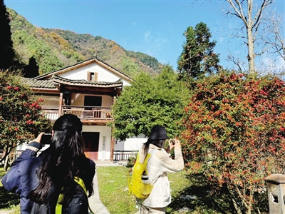 阳光明媚,三三两两的游客漫步在平武高村乡民主村老河沟故事艺术山居民宿前,有的游客拍摄芦苇袅袅掩映下红果累累的沙棘丛,有的游客捕捉蓝天下漫山红叶与远处雪山相映的画面。