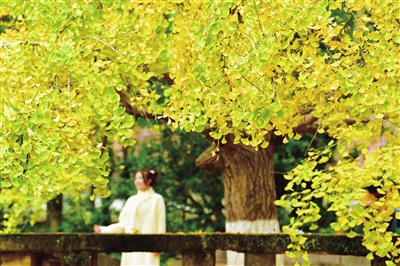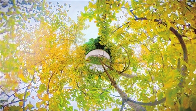 富乐山公园银杏满树披金,市民打卡拍照。 记者 王勇 摄