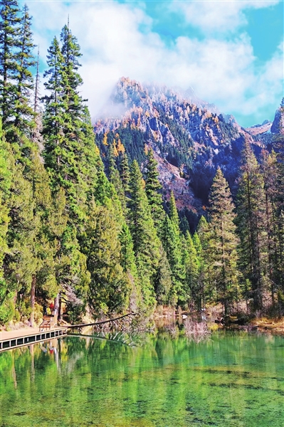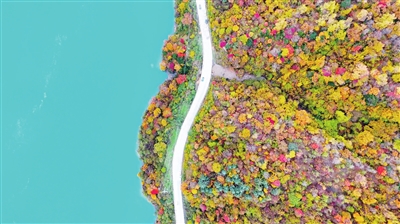 平武天母湖畔的彩林像天然调色盘。 记者 任露潇 摄