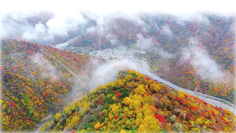 穿行于彩林之中的九绵高速。 记者 任露潇 摄