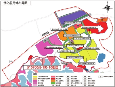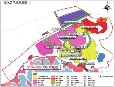 2.地块编码510700(E-19)-10-25(幼儿园用地)、26(城镇社区服务设施用地)用地等面积进行位置优调;