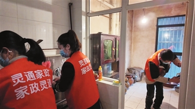 工作人员在老人家中帮忙做家务。 记者 陈元松 摄