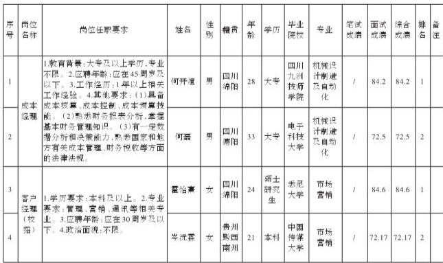四川九州电子科技股份有限公司关于招聘成本经理等岗位测试成绩的公示