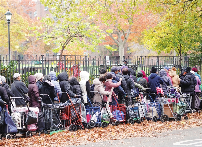 11月12日,人们在美国纽约一处食物发放点领取食物。 新华社记者 张凤国 摄