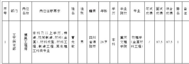 四川波鸿实业有限公司关于招聘四川威斯卡特工业有限公司绵阳分公司模具工程师岗位测试成绩的公示