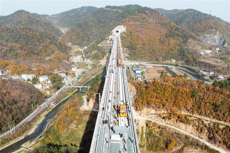 11月27日,在湖北十堰神定河特大桥上,西安至十堰高速铁路(简称“西十高铁”)全线最后一对长钢轨铺设落地,标志着西十高铁全线铺轨工程顺利完工,为后续联调联试奠定基础。