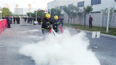消防员演示灭火器使用方法。 梁鸿博 摄