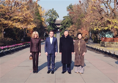 12月5日,国家主席习近平在四川省成都市都江堰同法国总统马克龙进行友好交流。这是习近平和夫人彭丽媛同马克龙夫妇合影。新华社记者 丁海涛 摄