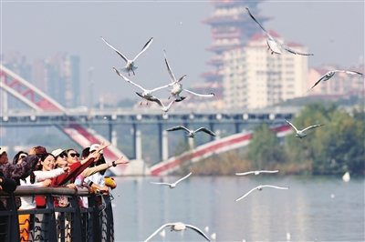 连日来,大批游客打卡三江半岛,与红嘴鸥互动嬉戏,成为独特的城市风景线。 记者 陈冬冬 摄