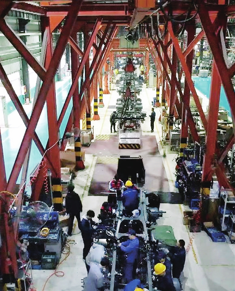 中国重汽集团济南卡车股份有限公司绵阳分公司生产车间内,车架在智能输送线上平稳流转,工人们手持工具,精准完成螺栓紧固、管线对接。 记者 谢艳 摄