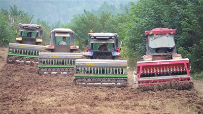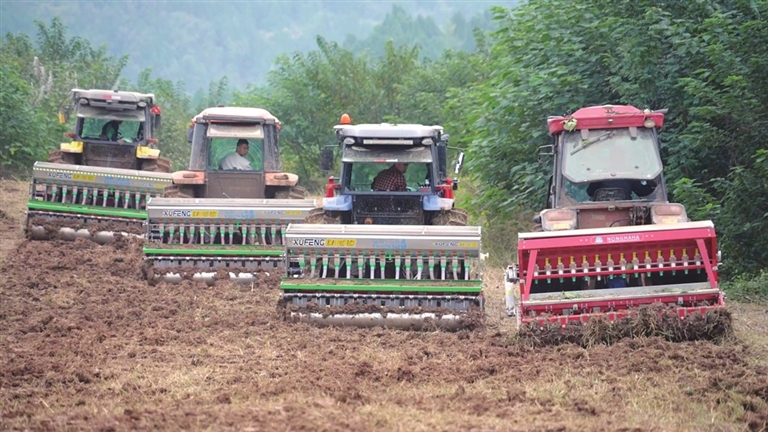 与此同时,中太镇鞍子村的坡地上,4台播种机正同步作业,一次性完成开沟、施肥、播种、覆土。富顺镇的姚建军则选用丰产性、抗性俱佳的“绵麦902”,“尽管播得晚,但通过良种良法配套,有信心管好这一季。”
