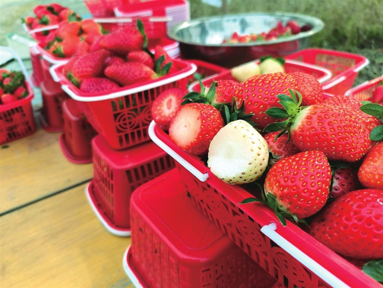 作为绵阳市品种最新、最齐全的草莓采摘基地之一,这里的草莓品种让人眼花缭乱。从经典的红艳、章姬到风味独特的白雪公主、草莓之王“香野”,再到2024年全新推出的新品种“越王”,12种风味的草莓齐聚一堂。其中,“越王”因其单果均重40-60克,可达17个糖的甜度水平,成为该基地今年最大的销售热点。
