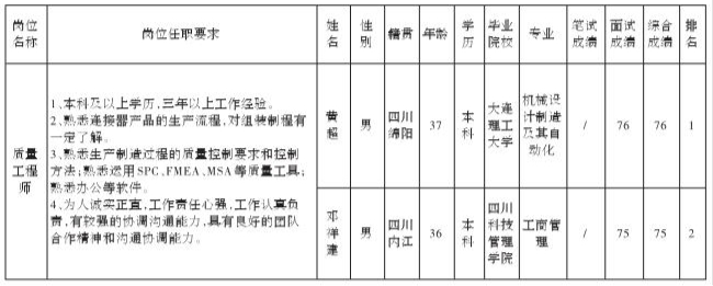 四川华丰科技股份有限公司关于招聘质量工程师岗位测试成绩的公示