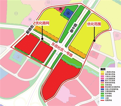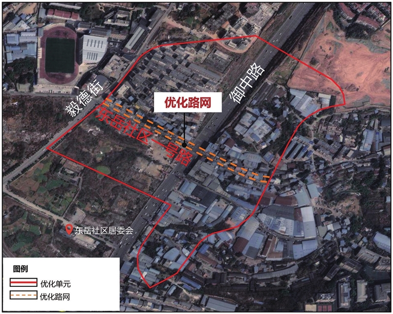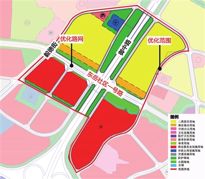 结合周边用地,优化道路线形,拟将东岳社区一号路位置向南平移约9米,周边地块用地面积相应变化,控制指标不变。